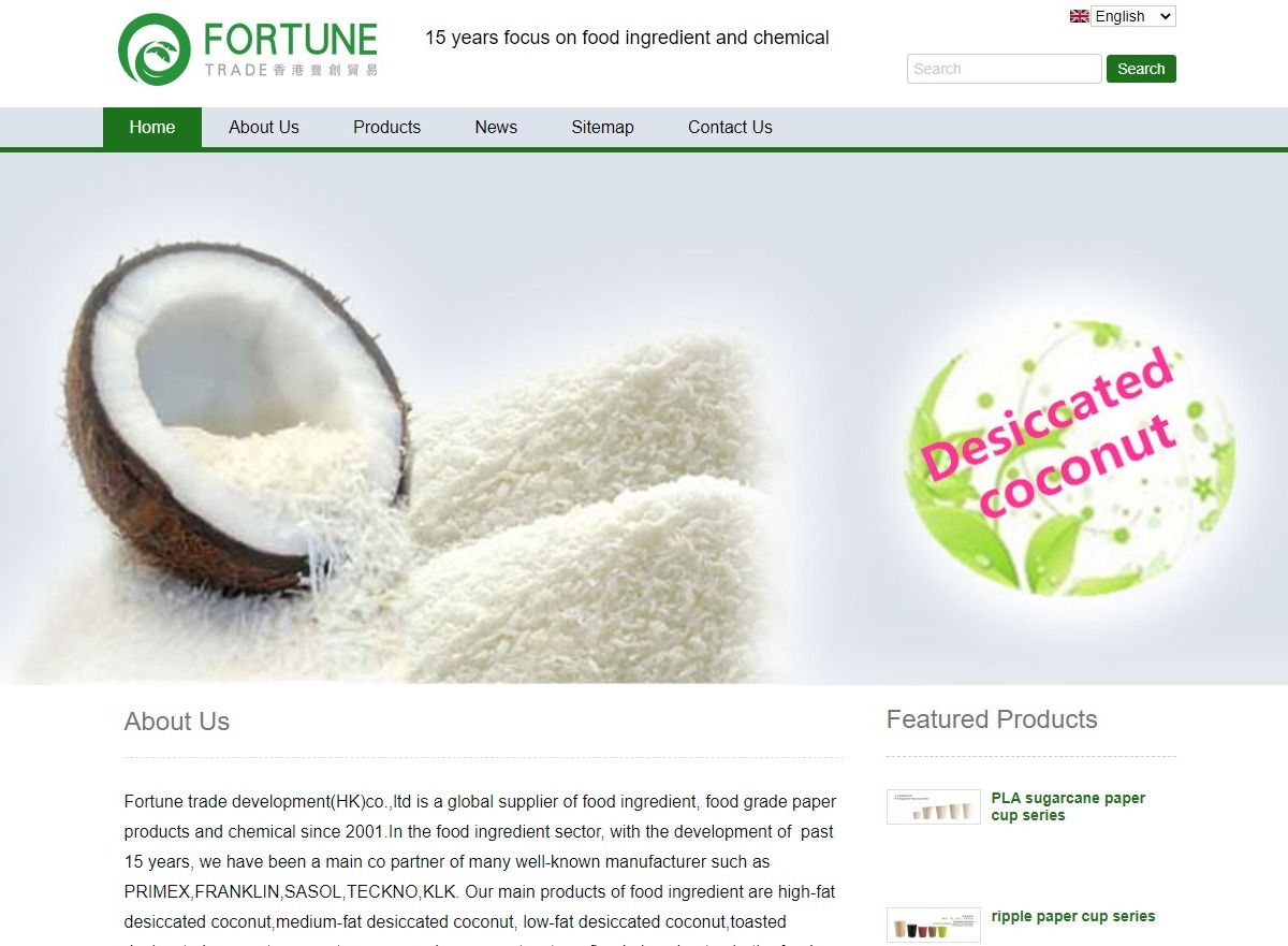 Fortune trade development(HK)co.,ltd is a global supplier of food ingredient, food grade paper products and chemical since 2001.In the food ingredient sector, with the development of past 15 years, we have been a main co partner of many well-known manufacturer such as PRIMEX,FRANKLIN,SASOL,TECKNO,KLK. Our main products of food ingredient are high-fat desiccated coconut,medium-fat desiccated coconut, low-fat desiccated coconut,toasted desiccated coconut, coconut cream powder, coconut water,refined glycerin etc . In the food paper products sector,our company has invest some paper products factories like paper cup factory, paper bowl factory, paper plate factory which mainly produce PE paper products series,eco-friendly PLA products series,eco- friendly sugarcane paper products series.Our paper products including coffee cup, milk tea cup, hot drink cup, cold drink cup, corrugated cup, ripple cup, soup bowl, soup containers etc. With years of professional experience we have sales network all over the world like China mainland, Europe,America,Middle east. The company's mission is to provide customers with superior products and technical support at competitive prices.